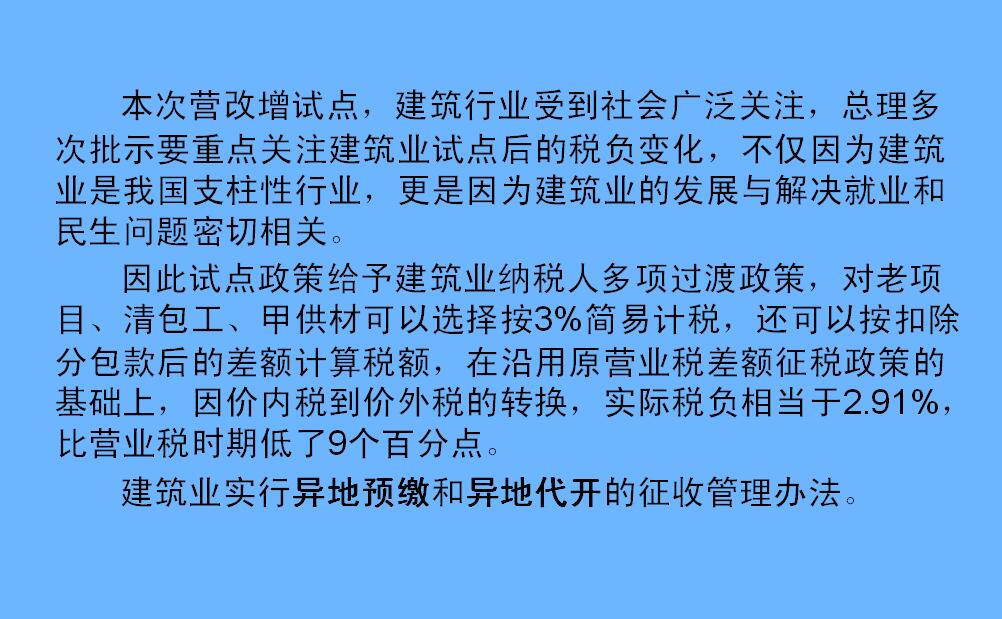 建筑業(yè)是我國支柱性產(chǎn)業(yè),建筑業(yè)的發(fā)展與解決就業(yè)和民生問題密切相關(guān),建筑行業(yè)“營改增”對于建筑業(yè)公司的發(fā)展至關(guān)重要,通過此次專題講座,使我司員工能熟知“營改增”的各項(xiàng)政策,避免工作中因增值稅發(fā)票的開據(jù)、管理等帶來一系列不必要的損失。